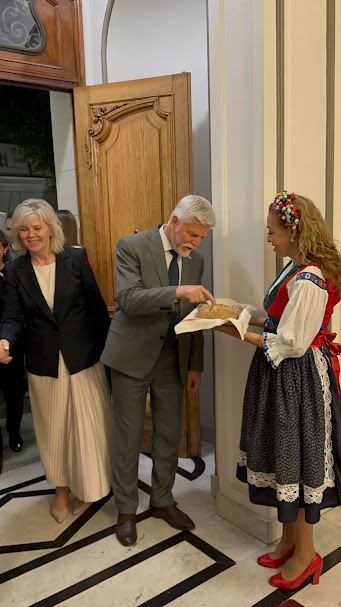 El Círculo Chileno Checo dio la bienvenida al Presidente, su esposa, su comitiva oficial y también a una delegación empresarial, con una tradicional costumbre checa: pan y sal.
